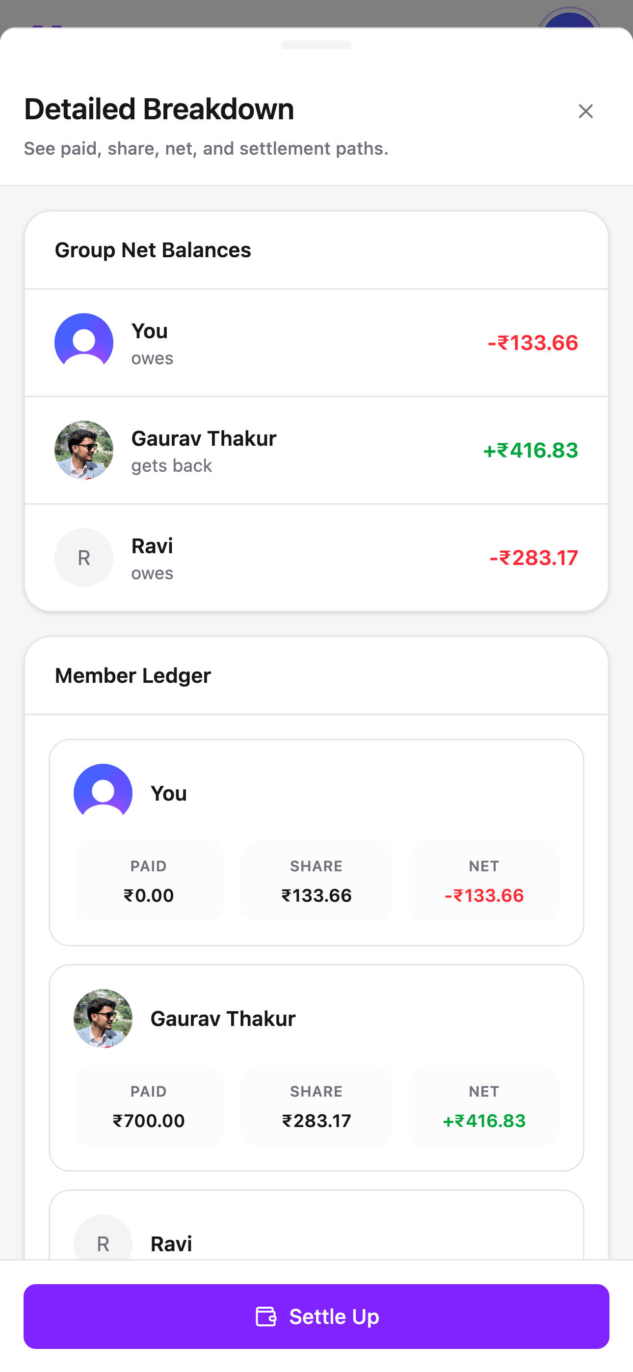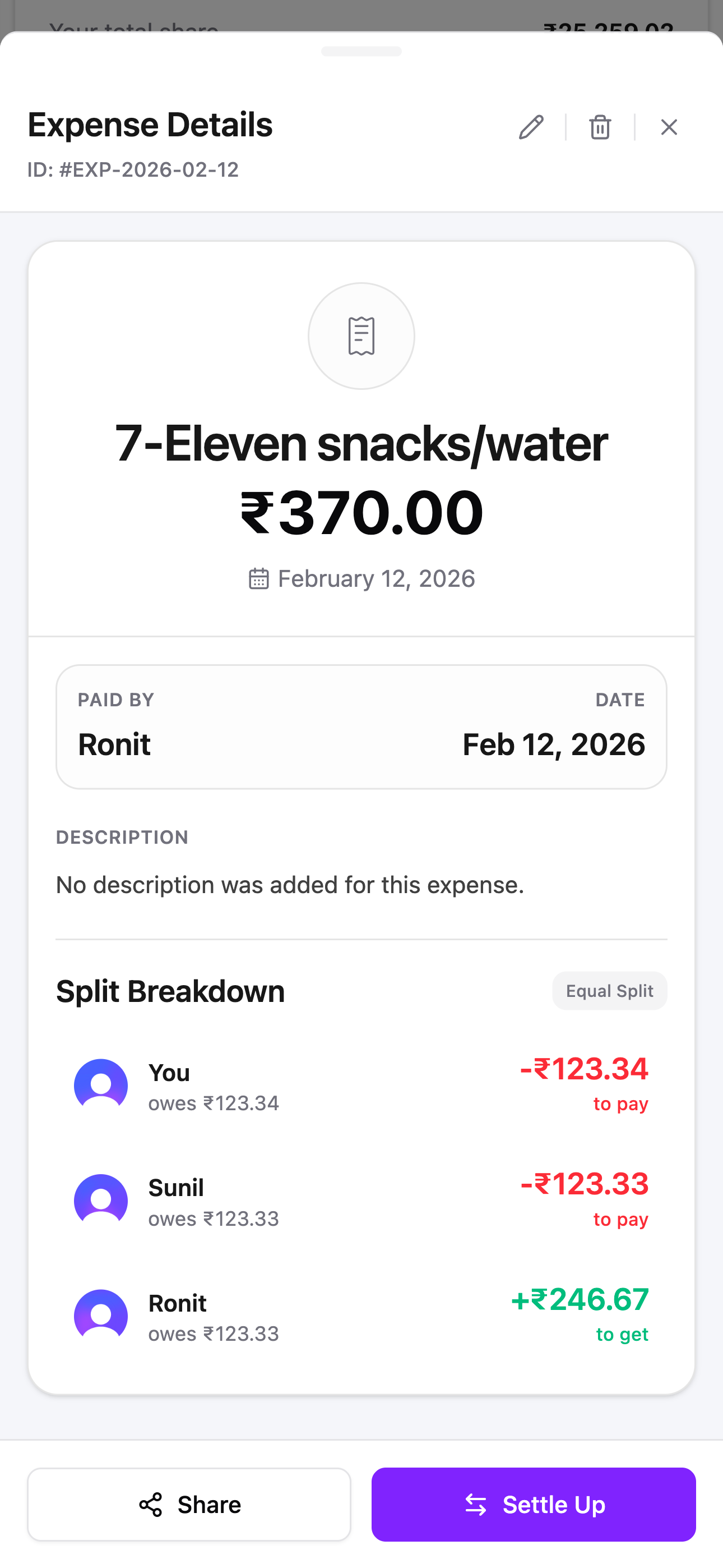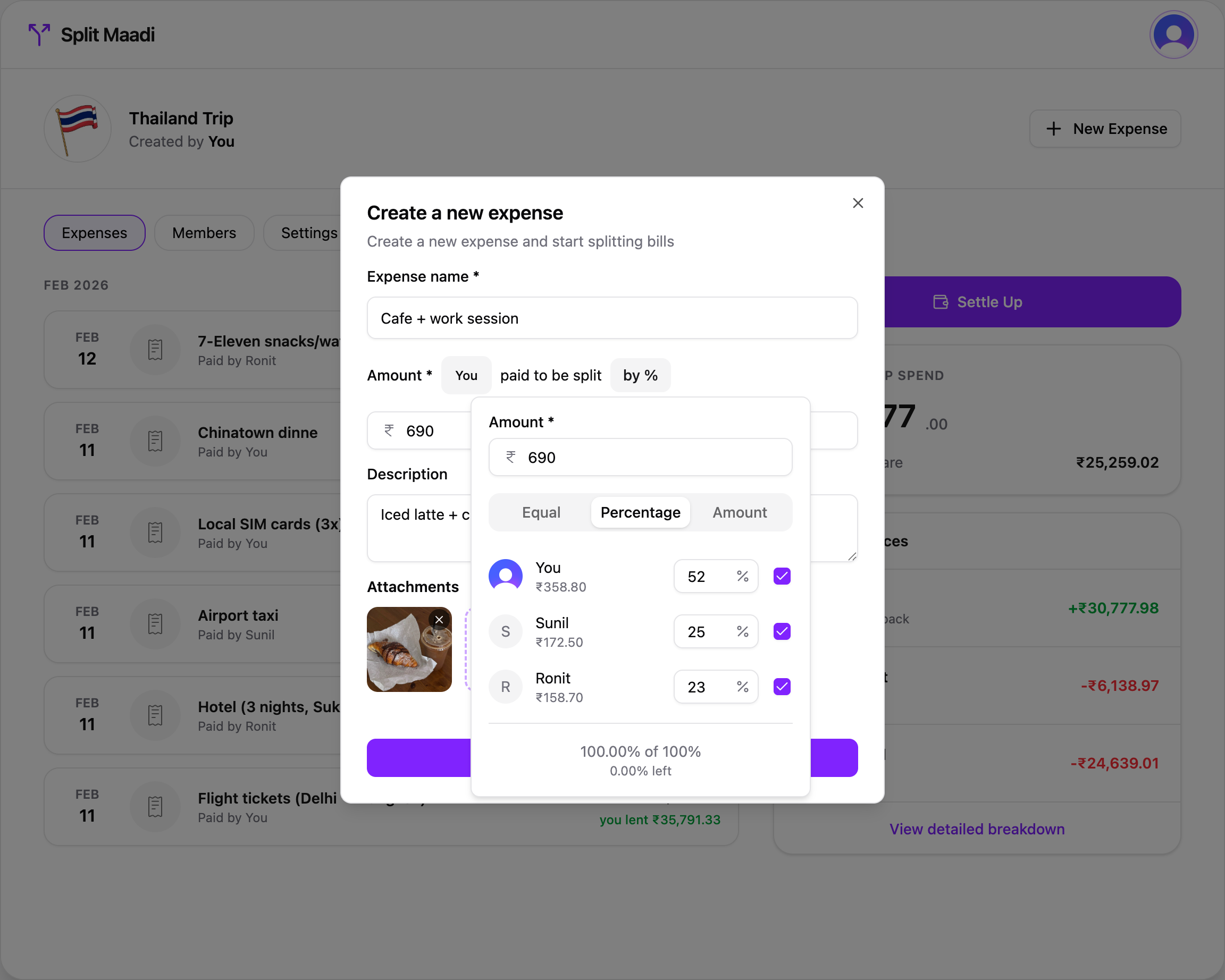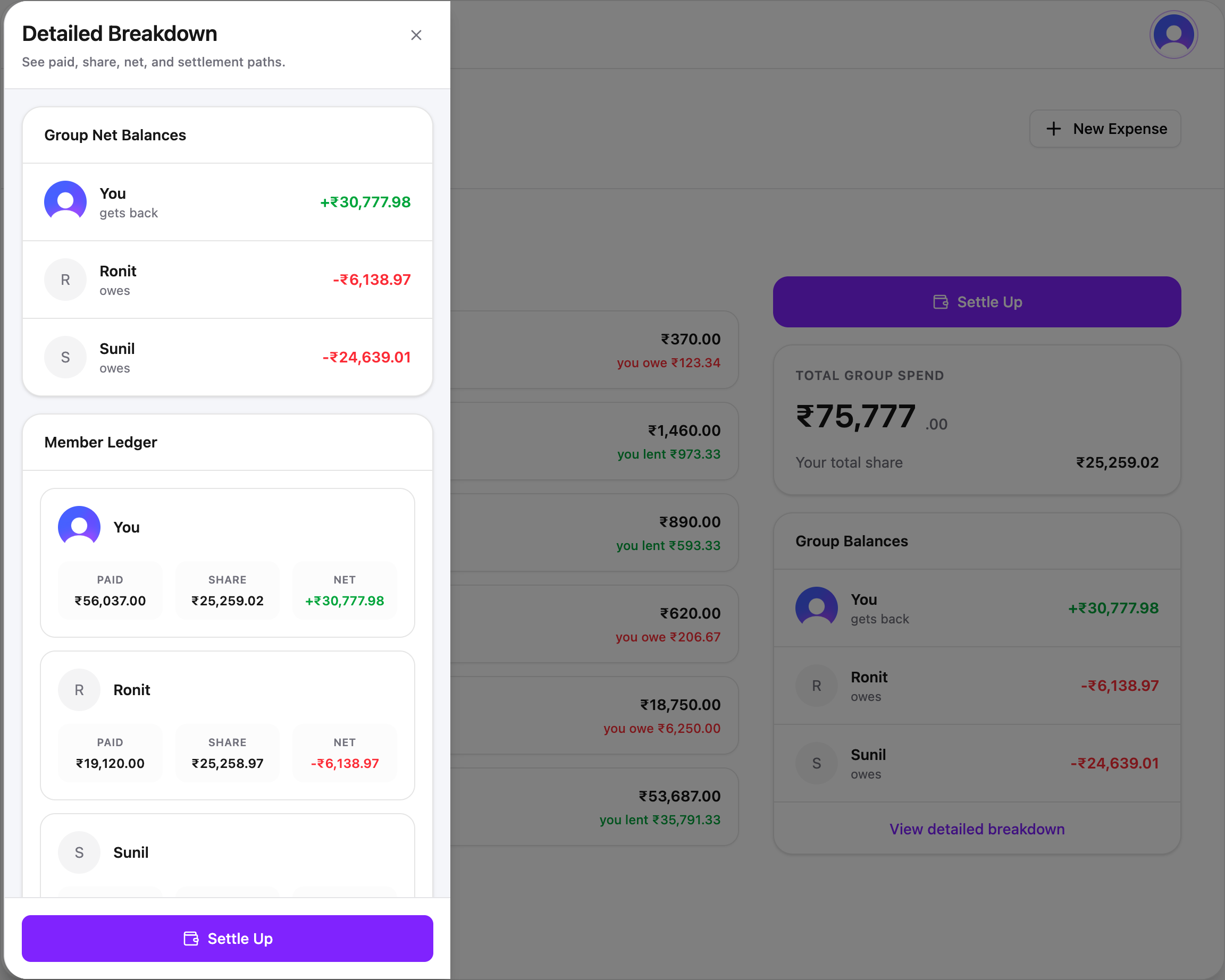 No more "who paid for what?" debates. Every expense shows the full split — who paid, who owes, and who gets back — with receipts and notes attached.