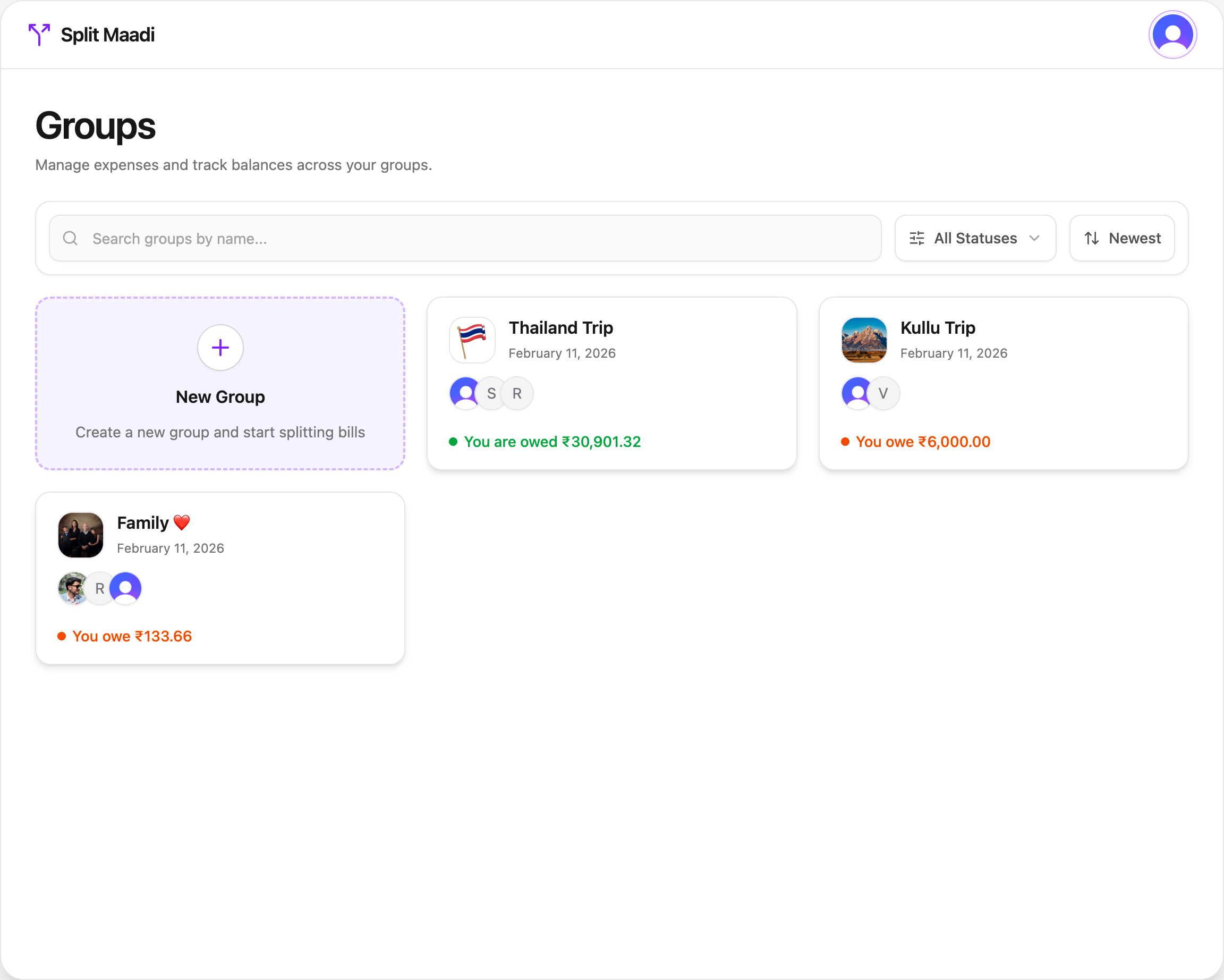 Every group, every balance, one screen. Jump into any group for total spend, member balances, and a complete expense timeline.