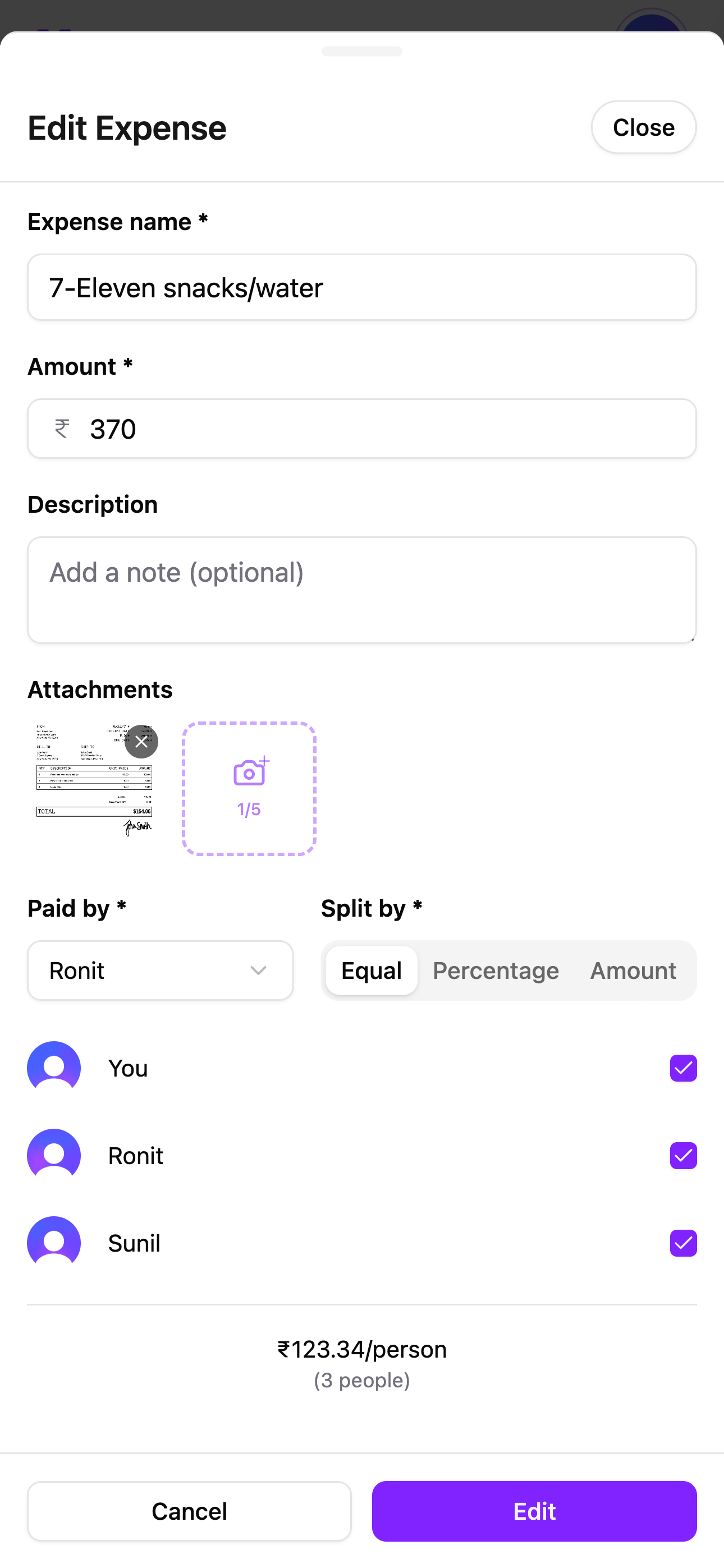 You can split equally, by percentage, or by exact amounts. You also choose which participants are involved in each expense.